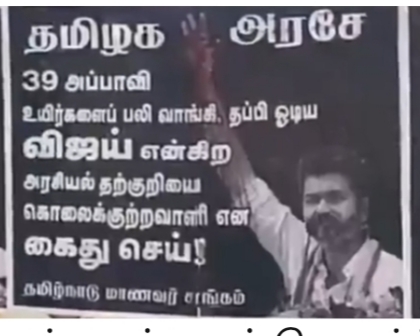 இந்த நிலையில், நடிகர் விஜய்யின் பனையூர் வீட்டை முற்றுகையிட்டு தமிழக மாணவர் மன்றத்தினர் நேற்று (செப்டம்பர் 28) போராட்டம் நடத்தினர். இந்த நிலையில் நடிகர் விஜய்யை கைது செய்ய வலியுறுத்தி சென்னை மாநகர் உள்பட மாநிலம் முழுவதும் தமிழக மாணவர் சங்கத்தினர் போஸ்டர்களை ஒட்டி உள்ளனர். அந்த போஸ்டரில், தமிழக அரசே, 39 அப்பாவி உயர்களைப் பலி வாங்கி, தப்பி ஓடிய விஜய் என்கிற அரசியல் தற்குறியை கொலைக்குற்றவாளி என கைது செய் என்று குறிப்பிடப்பட்டுள்ளது. இது தமிழக அரசியலில் பெரும் பரபரப்பை ஏற்படுத்தியுள்ளது.